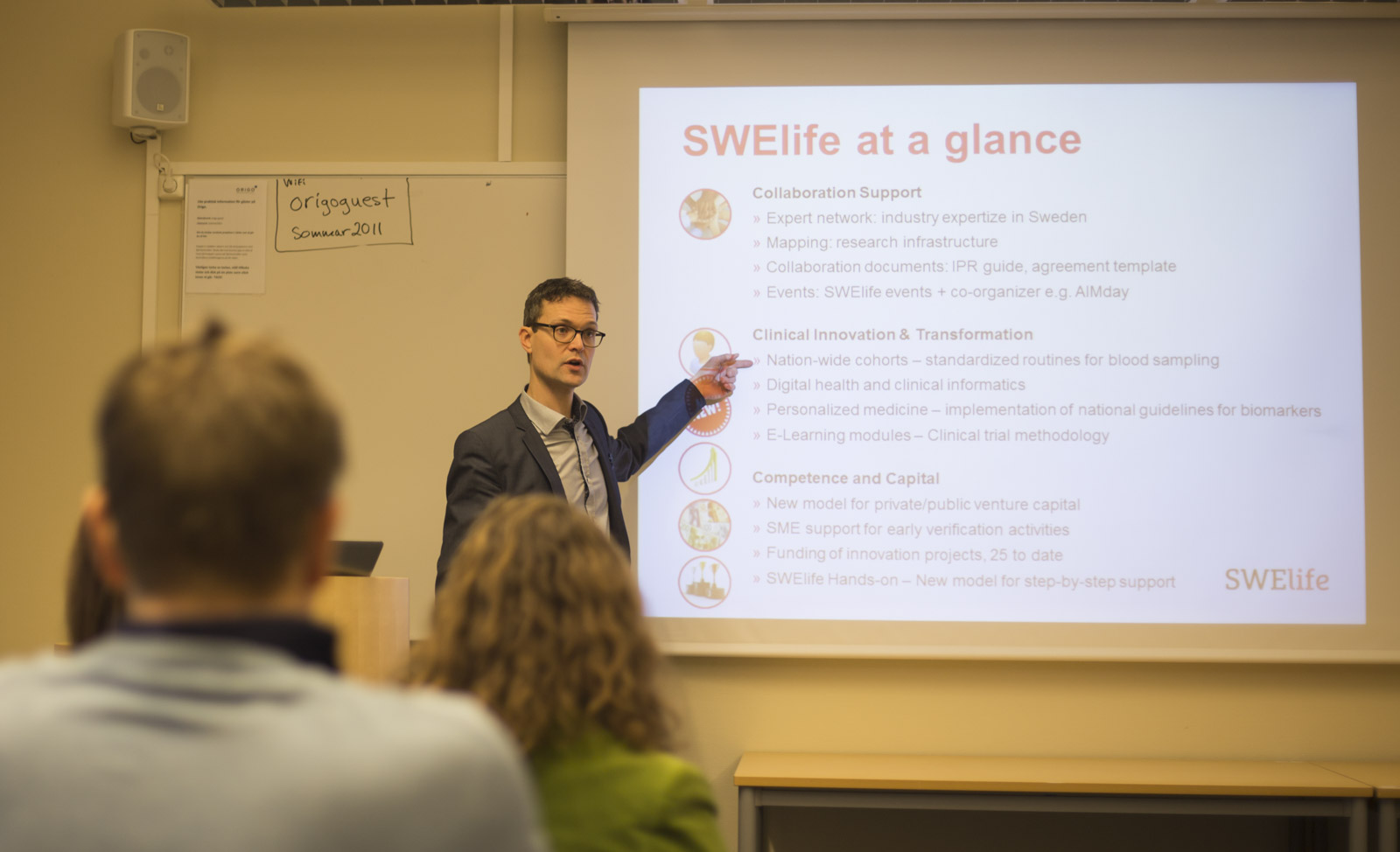 Peter Nordström från SWELife inledde med att berätta lite om VINNOVAs Strategiska Innovationsprogram samt om SWELife som precis stängt sin fjärde utlysning. Han nämnde att det fortfarande är en del ansökningar som faller ifrån på rena formalia-fel, att de inte fyllt i alla delar av ansökningsformuläret, missat att det krävs en samarbetspartner eller sökt två miljoner om max är en.